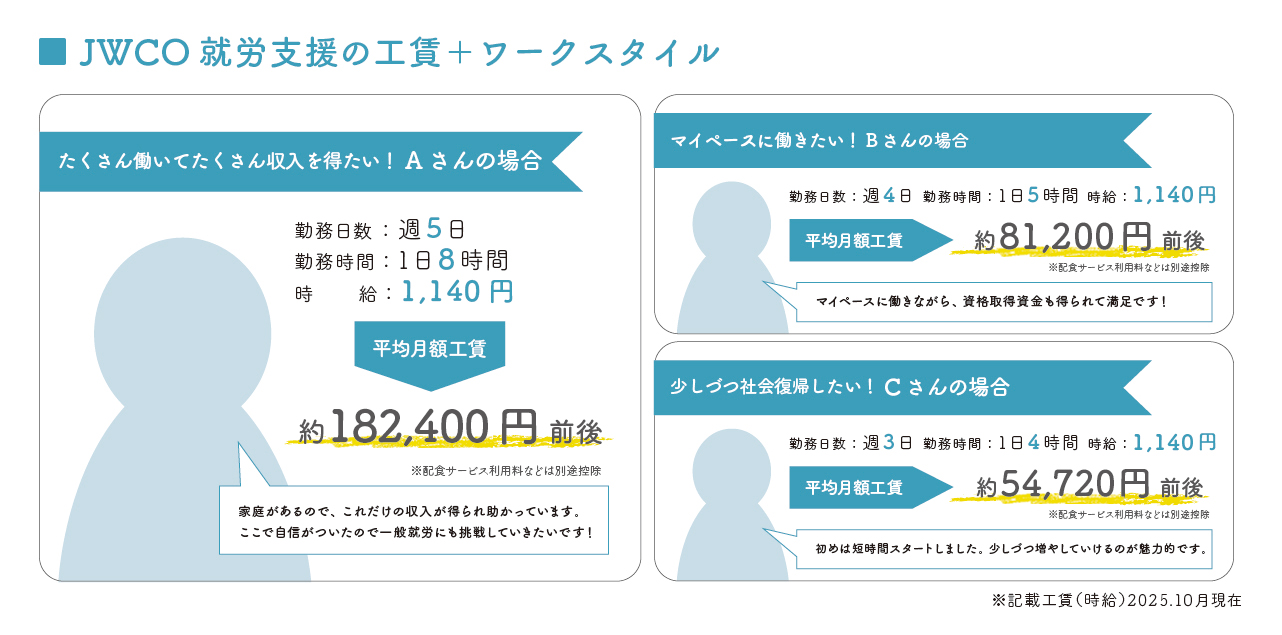 それぞれの目指すライフスタイルやワークスタイルに合わせてサポートいたします。しっかり稼ぎたい方から1日短時間から仕事に慣れたい方、様々な方が一緒に働いています。