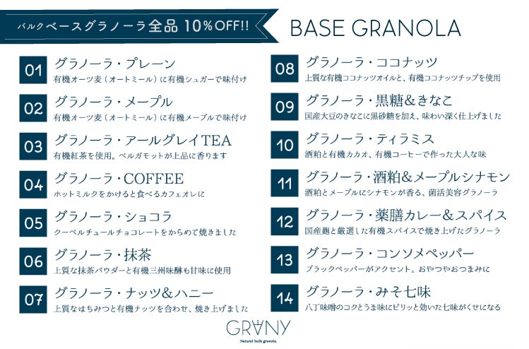 バルク販売の下記14種のベースグラノーラ全品10%オフとなります。何グラム、何種類以上ご購入でも10%割引のお得な1日です!ぜひお見逃しなく!