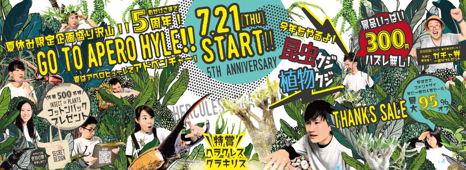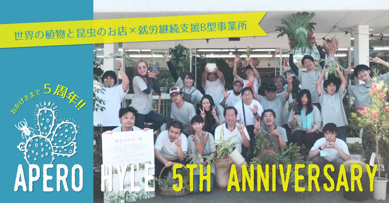 一般社団法人日本福祉協議機構(愛知県名古屋市、代表理事:濵野剣、以下「JWCO」)が運営する、就労継続支援B型事業所、世界の植物と昆虫のお店『APERO HYLE(アペロヒューレ)』が5周年を迎え、7月21日から8月31日まで、5周年の感謝を込め『店舗限定イベント』&『オンライン限定イベント』を開催いたします。