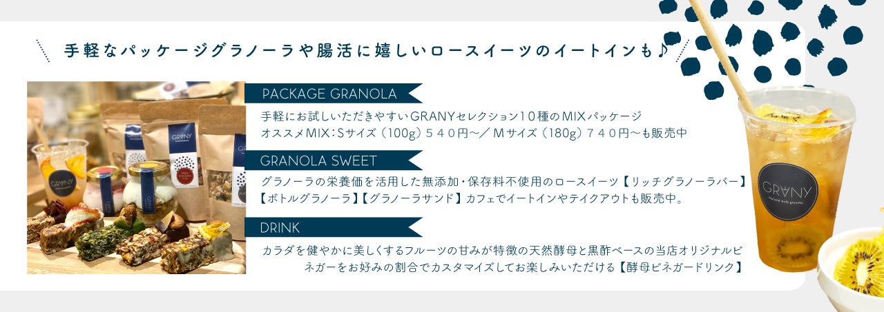 スイーツコーナでは、グラノーラの栄養価を活かした無添加・保存料不使用の手作りスイーツ【リッチグラノーラバー】や【グラノーラサンド】、GRANYオリジナル【酵母×ビネガードリンク】もイートイン、テイクアウトどちらもお楽しみいただけます。