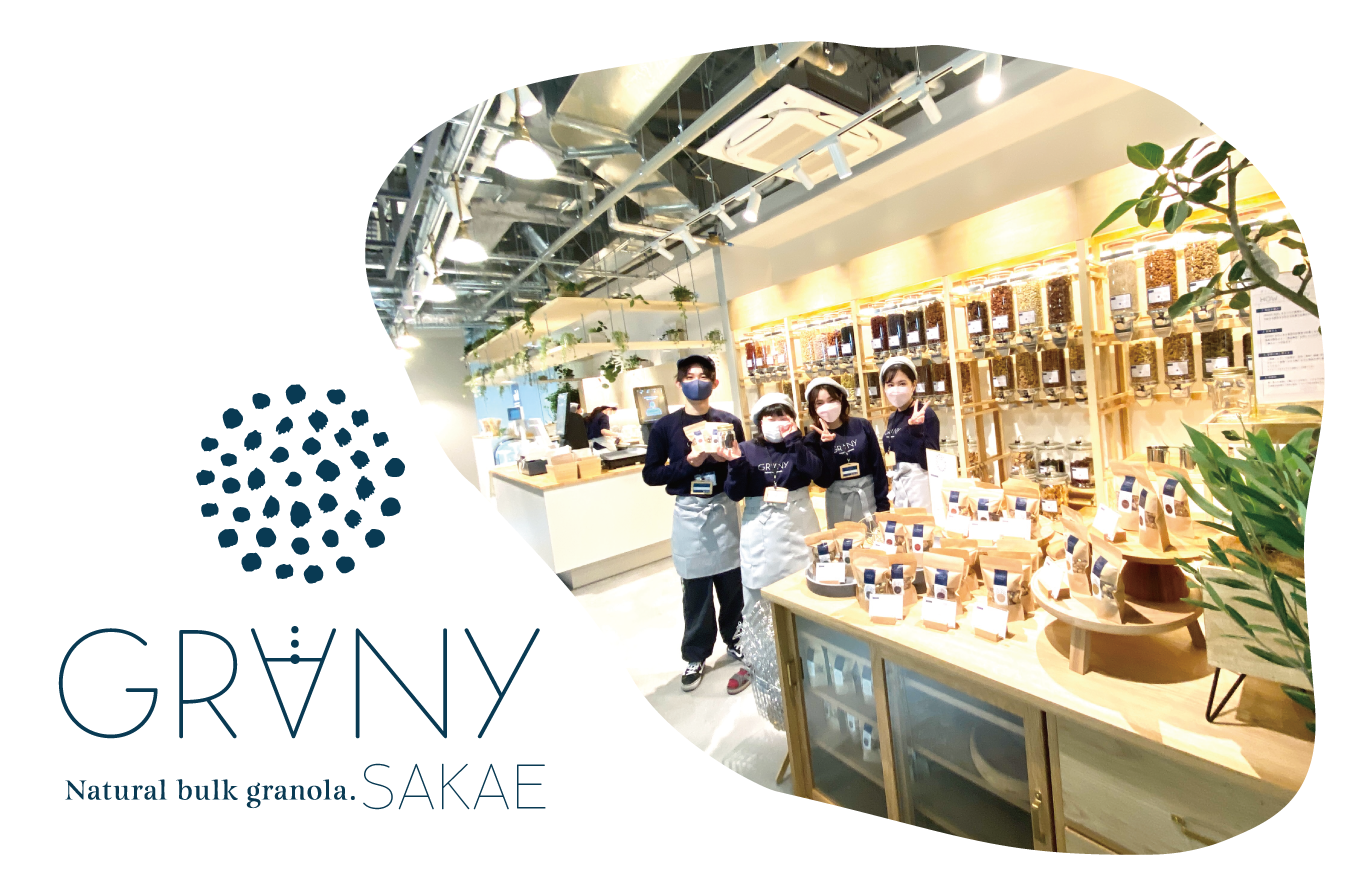 GRANYでは、無農薬、オーガニック素材を中心としたグラノーラを量り売りにて提供。厳選素材を自社キッチンにて手作りで製造。現代の日本では馴染みが低い Bulk(量り売り)ショップとなります。20gからの量り売りバルクコーナーにはオススメのフレーバーベース14種〜、その他ナッツやドライ野菜やドライフルーツが40種以上が並びます。お客様はその中からお好みのグラノーラを作ることができます。実際に素材を見て、試食していただきながら、お好みにあった素材やフレーバーをお選びいただけます。廃棄される不揃いの野菜や果物を活かした『おかずグラノーラ』では「薬膳カレー」味や、名古屋名物八丁味噌でつくる「みそ七味」など様々なフレーバーをお楽しみいただけます。(※栄マルエイガレリア店とは並ぶ素材が異なる場合がございます)