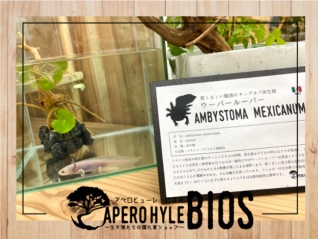 本店であるアペロヒューレにてオープン当時から飼育・販売・繁殖を行う人気者のウーパールーパー。この度BIOSにも新たな住家を作りました!ウーパールーパーはサンショウウオの仲間、羽のようなエラを持つメキシコサラマンダー(アホロートル)学名: Ambystoma mexicanum。日本では40年程前「ウーパールーパー」の名前で人気を博した生き物です。