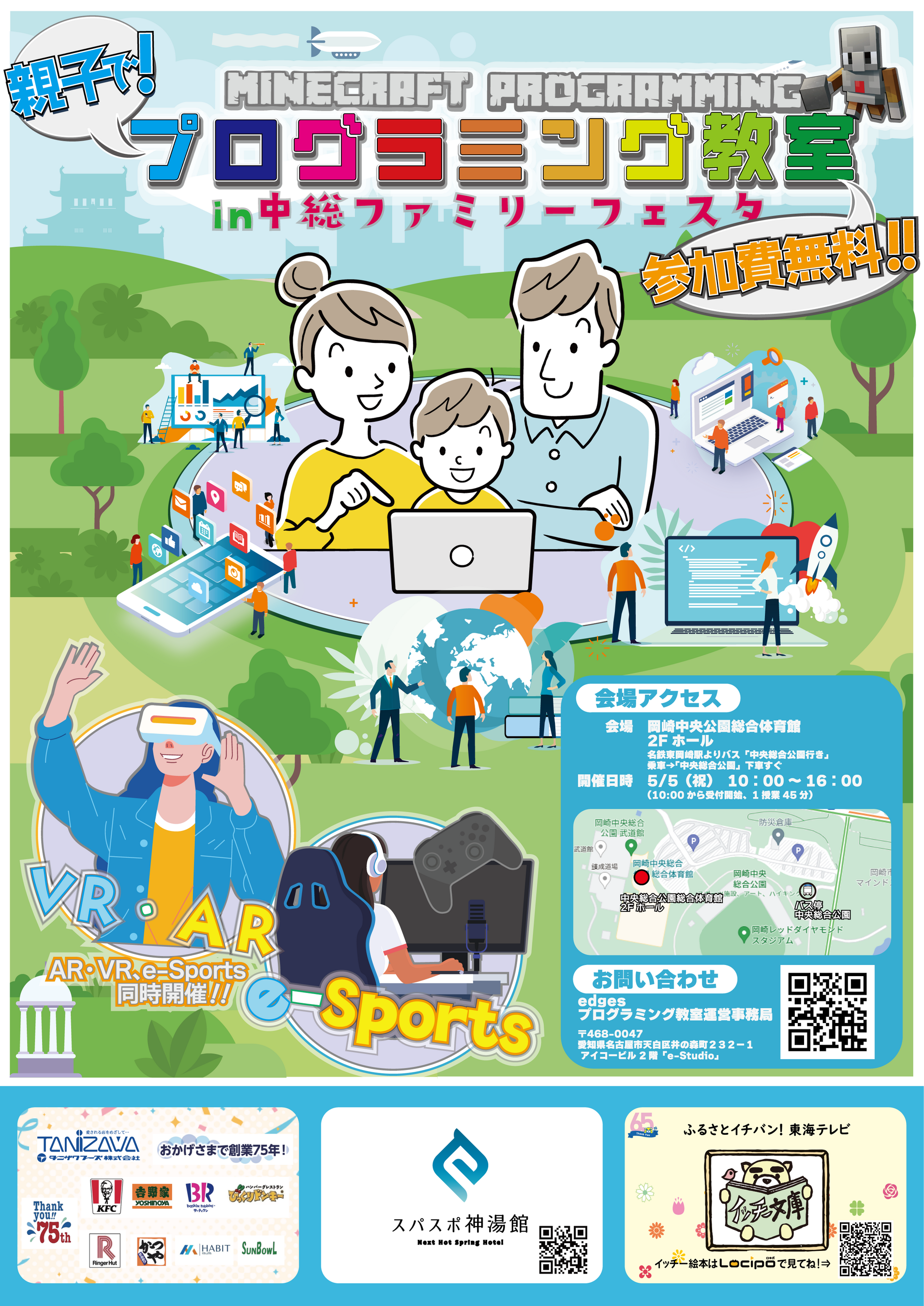 教育版の「マインクラフト」を使ったプログラミング教室をメインに、VR・ARやe-sportsの体験会など家族全員で楽しめる無料イベントを行います。